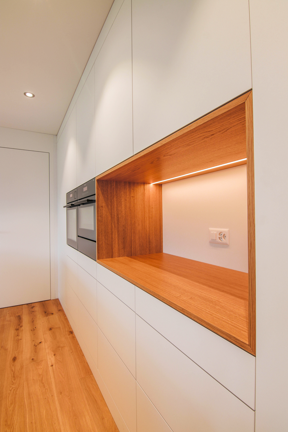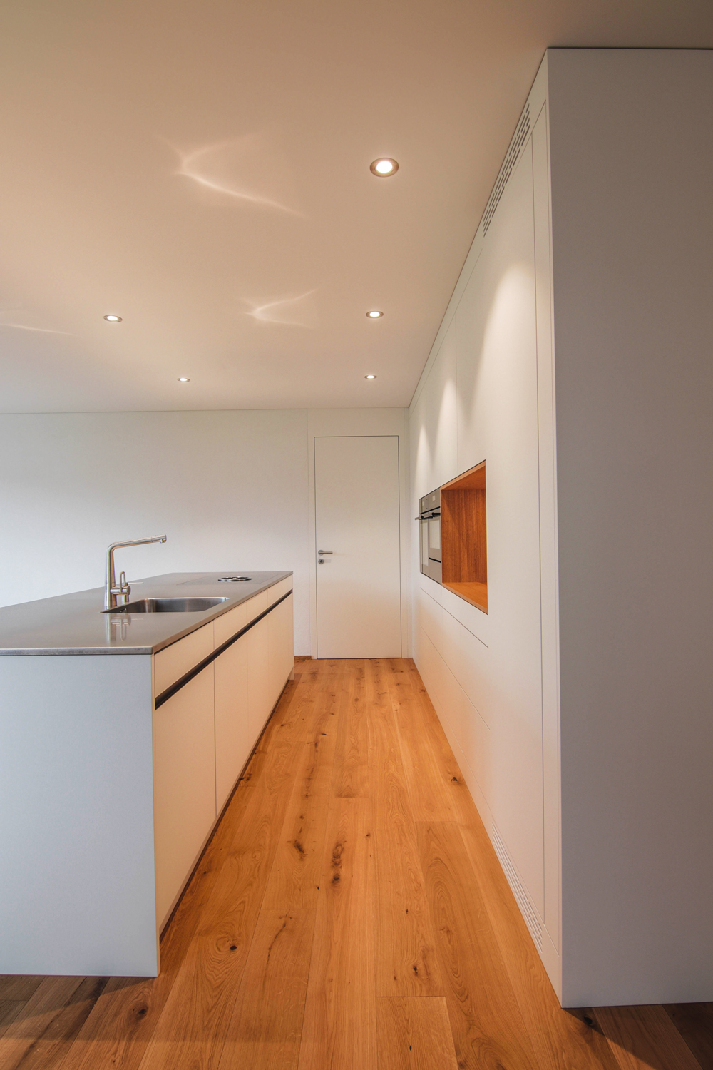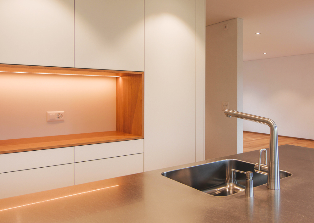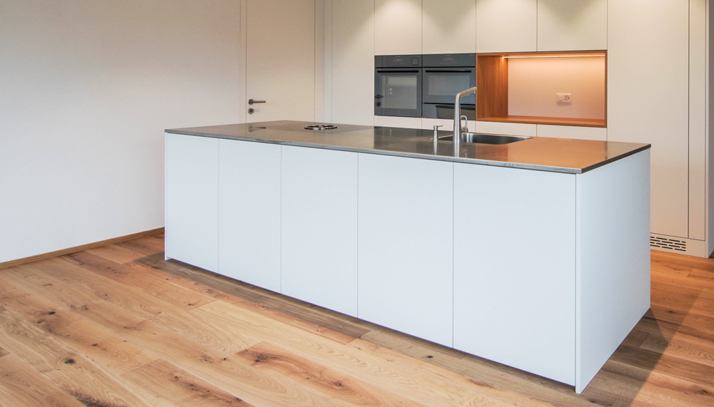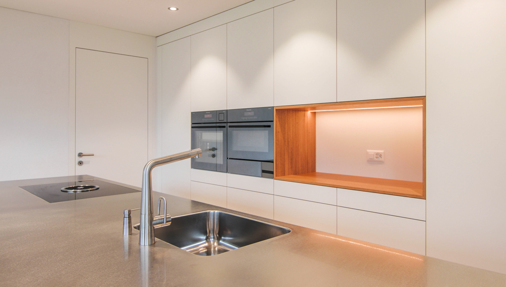 Küche in Kunstharz, Abdeckung in Chromstahl Wirbelfinish